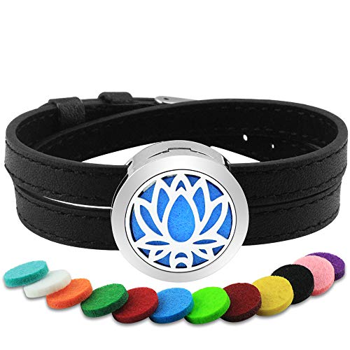 Lademayh Lotus Design Leather Bracelet Essential Oil Diffuser Aromatherapy Wristband for Women Girls (25mm, 12 Felt Pads)