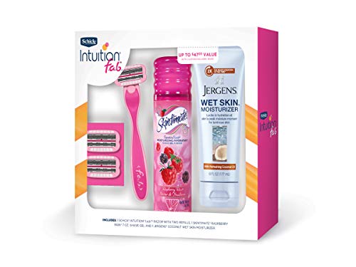 • Schick Intuition f.a.b. Razors for Women Gift Set with 1 Intuition f.a.b. Razor, 3 Razor Blades Refill, 1-7oz Skintimate Shave Gel and 1-6oz Jergens Coconut Moisturizer